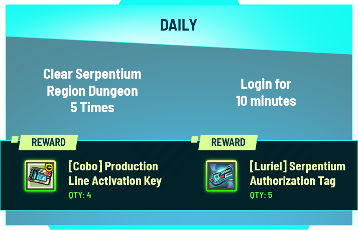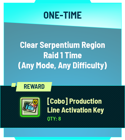 Lv. 99 or higher, once per account [Cobo] Production Line Activation Keys will not be added to your inventory; instead, the amount you have can be directly seen in the Event UI. Any unused Activation Keys will be deleted on 04/07/2026 (23:59 PDT) Overclock the system for maximum efficiency!