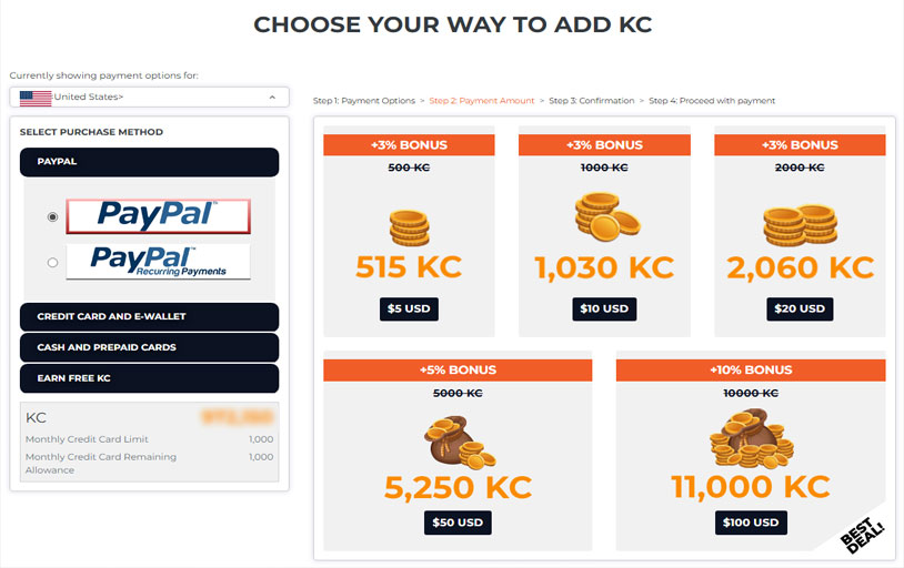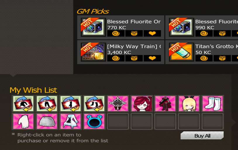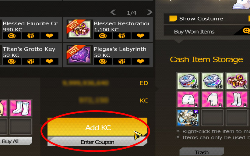 If you wish to purchase the items, you can load up on KC via the Add Cash button.